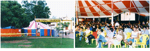 Apesar da mudança de local, a estrutura ainda funcionava de maneira precária. Nesta fase, eram montadas duas tendas: a primeira delas, uma tenda de circo tradicional, destinada à área de convivência; a segunda, uma tenda galpão, 20,00 x 20,00m, com uma proporção e forma mais adequadas para a exibição de filmes, mas sem acabamentos internos. Nela, funcionava a sala de projeção (fig.4). O valor simbólico da tenda de circo ainda era explorado e ela era montada na frente da tenda galpão (Vargas, comunicação pessoal, setembro de 2018).