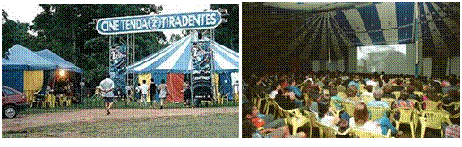 Segundo Hallak (comunicação pessoal, setembro de 2018), a 1º edição ocorreu de forma poética, idealizada, e a escolha da tenda circense (fig. 2) se deve mais a uma associação deste tipo de estrutura com o simbolismo do espetáculo itinerante que chega na cidade do interior, do que a qualquer consideração prática. Esta escolha foi importante para a aceitação do novo evento pelos moradores locais, pois fazia referência a uma atividade na qual eles se reconheciam e com a qual se identificavam, criando predisposição para vivenciar uma nova experiência. Pablo Pires (comunicação pessoal, outubro de 2018) destaca os efeitos positivos da gratuidade da programação: “Este aspecto de aproximar o público da cidade, carente de tal informação, lazer e acesso à arte, proporciona um encontro especial e singular entre os festivais brasileiros de cinema. E cumpre um papel social importante.”