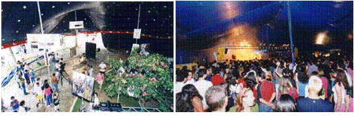 Uma grande tenda galpão com as dimensões de 20,00 x 40,00 m foi montada para receber a sala de exibição e 5 tendas menores foram utilizadas para a instalação da área de shows, bar, café e banheiros químicos (fig.7). A área total de instalação das estruturas provisórias era de 1.200m², ocupando agora a maior parte do espaço disponível do estacionamento da Rodoviária, que antes era apenas parcialmente ocupado. Porém, ainda não havia um projeto cenográfico para dar a estas tendas uma unidade formal ou um tratamento estético que expressasse a linguagem visual do evento. A solução para a distribuição dos espaços foi desenvolvida pela própria Universo, com a experiência adquirida ao longo das montagens anteriores, visando melhorar o funcionamento.