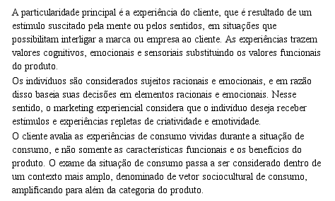 Dessa maneira, observa-se, segundo o Quadro 6, que o foco está na experiência (e não mais no valor funcional do produto), durante as situações de consumo vivenciadas pelos clientes, que desejam ser estimulados na sua emotividade. Aquilo que é experienciado é avaliado de maneira mais amplificada pelos consumidores.