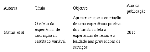 Na literatura internacional, a pesquisa sobre o processo de cocriação e a sua relação com a prestação do serviço é enfatizada em publicações dos autores Zátori et al. (2018), Eletxigerra et al. (2017), Neuhofer et al. (2015) e Prebensen et al. (2013). Estudos relacionados à cocriação e ao comportamento de consumo são evidenciados por Payne et al. (2008), Suntikul & Jachna (2016) e Pacheco (2016). Também foram encontradas publicações sobre a cocriação e o marketing de experiência (Gentile et al., 2007; Torres, 2018; Zátori et al., 2018) e sobre a tecnologia da informação (Franke & Schreier, 2010; Suntikul & Jachna, 2016).