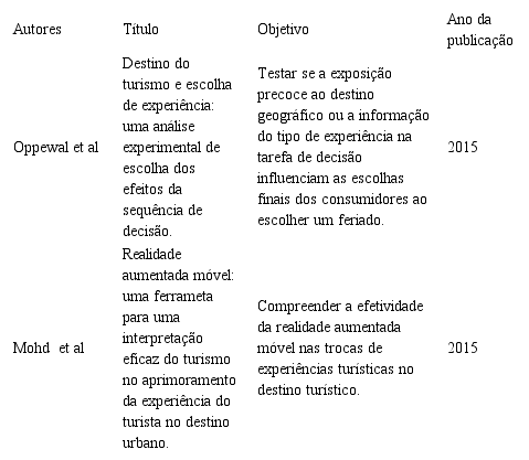 No intuito de analisar estudos sobre os temas, realizou-se uma revisão sistemática Portal de Periódicos CAPES com uma linha de corte de 5 anos, analisando o resumo, objetivo, metodologia e resultados das pesquisas, com buscas pelas palavras-chaves “Tourism co-creation”, “Co-creation tourism experience”, “Tourism destination experience” e “Tourism experience”. Para a primeira palavra-chave, 28 pesquisas foram apresentadas. Entretanto, apenas uma delas esteve diretamente vinculada aos temas deste estudo (Quadro 1). A pesquisa da segunda palavra-chave resultou em 15 pesquisas e nenhuma apresentou relação com a cocriação, destinos turísticos e a experiência turística. Relativo à terceira palavra-chave, houve um total de 9 artigos, sendo um relacionado ao turismo e ao marketing de experiência (Quadro 2). Por fim, quanto à quarta palavra-chave, duas pesquisas indicaram relação com os temas desta pesquisa (Quadro 3).