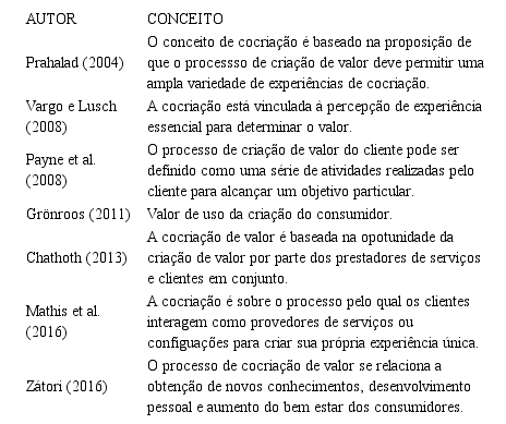 O entendimento da cocriação de valor, deve ser visto sobre uma ótica interativa, dinâmica e não-linear. O processo de cocriação de valor, por parte do consumidor, no modelo de Payne et al. (2008), abarca o aprendizado do consumidor e a sua relação com a experiência, a qual envolve emoção, cognição e comportamento. A emoção vincula-se a sentimentos, humor e afeto. Na cognição, os consumidores estão envolvidos, principalmente, na avaliação de opções disponíveis, decidindo, se devem ou não adquirir um determinado serviço ou produto. Por fim, o comportamento vai além do processo das decisões de compra, incluindo as experiências dos clientes como resultado do consumo do serviço ou produto. O Quadro 4 apresenta alguns dos principais autores e conceitos que versam sobre a cocriação de valor.