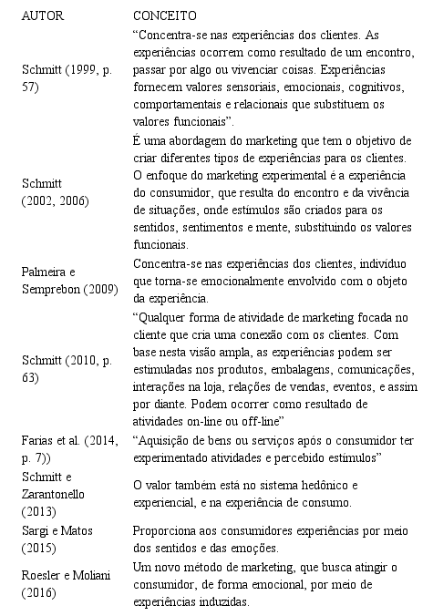 O Quadro 5 apresenta os conceitos de marketing de experiência, segundo seus principais autores.