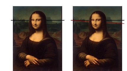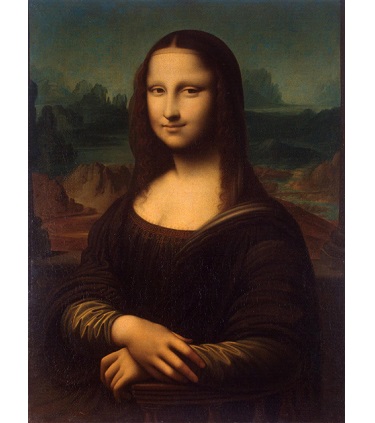Aqui o intrigante sorriso depende exactamente do trabalho sobre a linha do horizonte. Esta apresenta-se descontínua – numa parte do quadro é horizontal e noutra está ligeiramente inclinada – o que faz com que os cantos da boca e dos olhos sejam percebidos de duas maneiras diferentes relativamente às duas posições da linha do horizonte, gerando como que uma movimentação imperceptível, de que resulta a peculiaridade da expressão retratada.