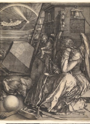 Esta célebre representação de Dürer condensa em si os caracteres do homem paradigma do Renascimento: o artista, o génio, oscilante entre os momentos de fervilhante criatividade, que o assemelham quase a um deus, e os de profunda depressão, de esgotamento. Este personagem – excêntrico, às vezes solitário, outras boémio, às vezes misantropo, outras entregando-se à mais desbragada luxúria, quase patologicamente ciclotímico – é produto da ruptura civilizacional do final da Idade Média. Ruptura com um teocentrismo social e de Estado, onde a personalidade individual era pressionada a se anular, ruptura que abre caminho para uma visão antropocêntrica de si e do mundo, visão ultimamente, só e fechada sobre si. Já não é Mercúrio – patrono dos laboriosos e zelosos artesãos das guildas – que preside aos destinos do protótipo de homem desta nova idade, mas sim Saturno[76], deus do tempo, aquele que devora os seus filhos (nós?!). Dante, por primeiro, consegue salvar esta divindade tenebrosa, colocando no seu círculo – o sétimo céu – os contemplativos (onde, contudo, Beatriz não ri)[77]. Depois, Ficino, que considera a introspecção, consequente à melancolia, um reverso necessário ao rasgar de entranhas que é o esforço criativo do artista, e ao êxtase entusiasmado (en-theos, tal como os místicos) do parto feliz da criação[78].