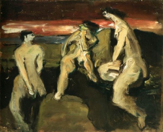 Ela está com a cabeça inclinada, apoiada num braço, triste, lassa, saturnina. Mas o olhar brilha ainda, luta para se levantar: os olhos como que empurram para cima, na direcção do céu, o sobrolho carregado. Ao fundo um horizonte de mar, feito brilhar por uma estrela...