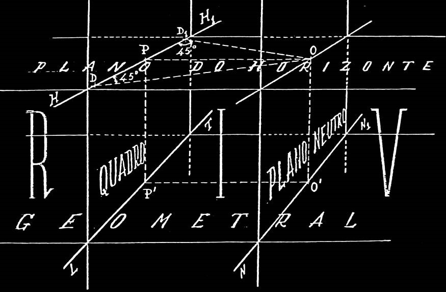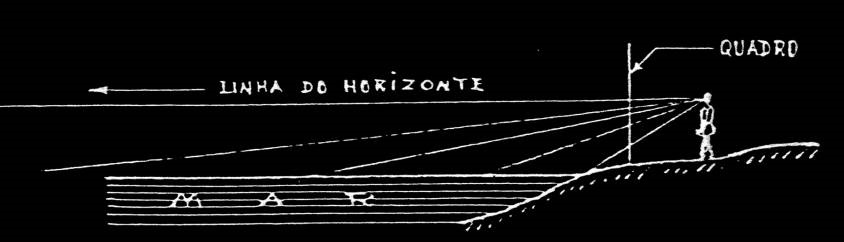 A linha–do–horizonte resulta, como vimos, da intersecção entre o plano do geometral e o plano do horizonte (veja–se de novo a Figura 2). O plano do horizonte corresponde ao plano horizontal onde estão situados os olhos do observador; o plano do geometral corresponde ao plano horizontal onde estão situados os pés do observador, ou seja, é de algum modo, o plano da Terra. A intersecção entre estes dois planos acontece no infinito, sob a forma de uma recta, disposta numa posição de frente para o observador. Essa recta é depois passível de projecção no quadro, numa situação próxima.