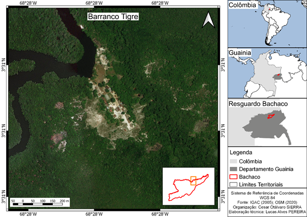 A investigação ocorre na comunidade indígena de Barranco Tigre, a qual se localiza às margens do rio Caño Bocón, um tributário do rio Inírida, o qual faz parte da Estrella Fluvial del Inírida, um encontro de águas que configuram os principais afluentes do rio Orinoco. Reconhecida pela sua diversidade biológica, aquele território encontra-se sob a condição internacional de conservação de sítio RAMSAR desde 2014. Esse local faz parte da área geográfica que configura os limites entre as bacias dos rios Orinoco e Amazonas (Noroeste da Amazônia), e se encontra na região da Amazônia colombiana.