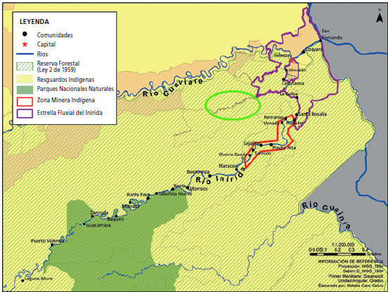 Aliás as FARC (Fuerzas Armadas de Colombia), a maior guerrilha do País até sua desmobilização em 2016, estiveram interessadas no controle das rendas da mineração de ouro e wolframitas (tungstênio) na bacia alta e média do rio Inírida, o que complicou ainda mais a atividade mineradora tradicional. Porém, é necessário mencionar que foram as comunidades indígenas, a partir da interação direta com as FARC, que impediram sua chegada até a baixa bacia do rio, onde fica a comunidade de interesse desta pesquisa e a capital do Departamento, Puerto Inírida (Lopez-Vega, 2016).