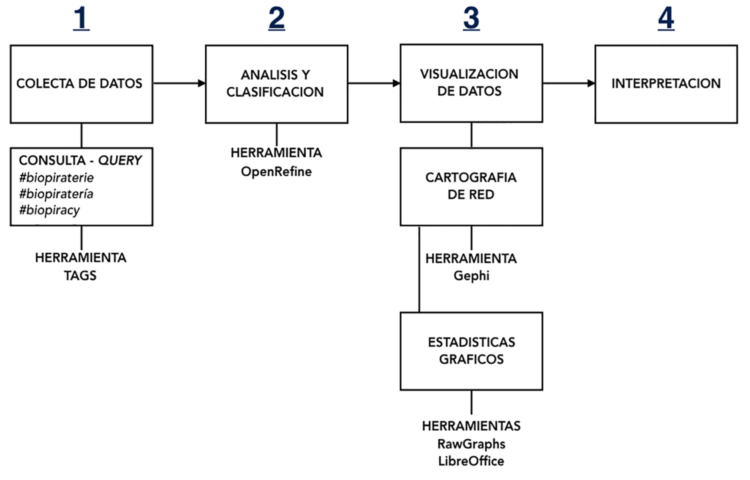 El método se desarrolló en cuatro etapas: la extracción o la colecta de datos, el análisis y la clasificación, la visualización y finalmente la interpretación.