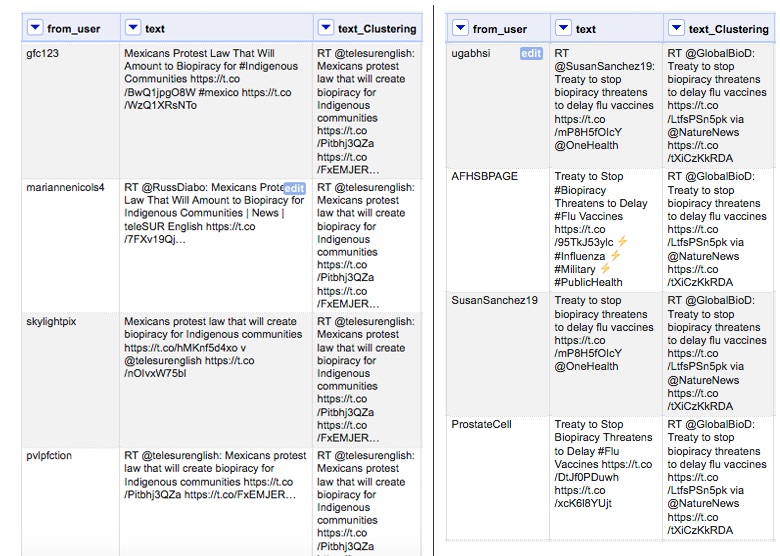 2. En la segunda etapa, con la herramienta OpenRefine [6] se desarrolló el análisis, la clasificación y la limpieza general de la base de datos (DB) colectada en TAGS. Con el objetivo de analizar todos los tweets registrados se decidió desarrollar la cartografía de red a partir de la relación entre los usuarios y los tweets. Para el tratamiento y el análisis de los tweets se realizó un agrupamiento (clustering) de los textos, por lo cual se agrupo en una misma categoría una publicación normal y un RT, así como otras con ciertas variaciones en el texto (Fig. 2). Asimismo se analizaron los textos de los tweets para encontrar rastros (traces[7]) sobre organizaciones, activistas, empresas y plantas medicinales o productos relacionados con las MT y se creo una nueva variable en la BD para añadir el nombre de la entidad o de la planta.