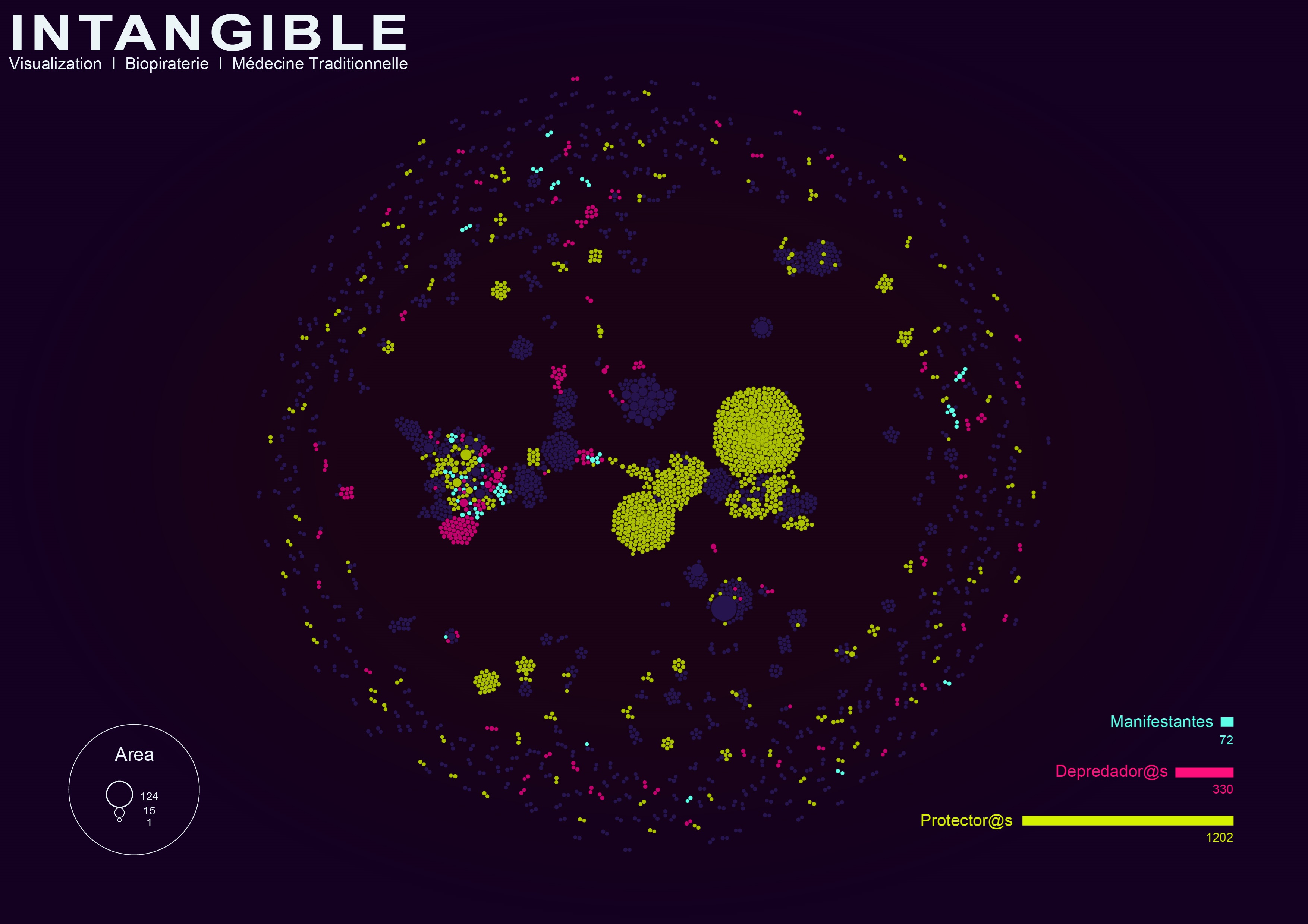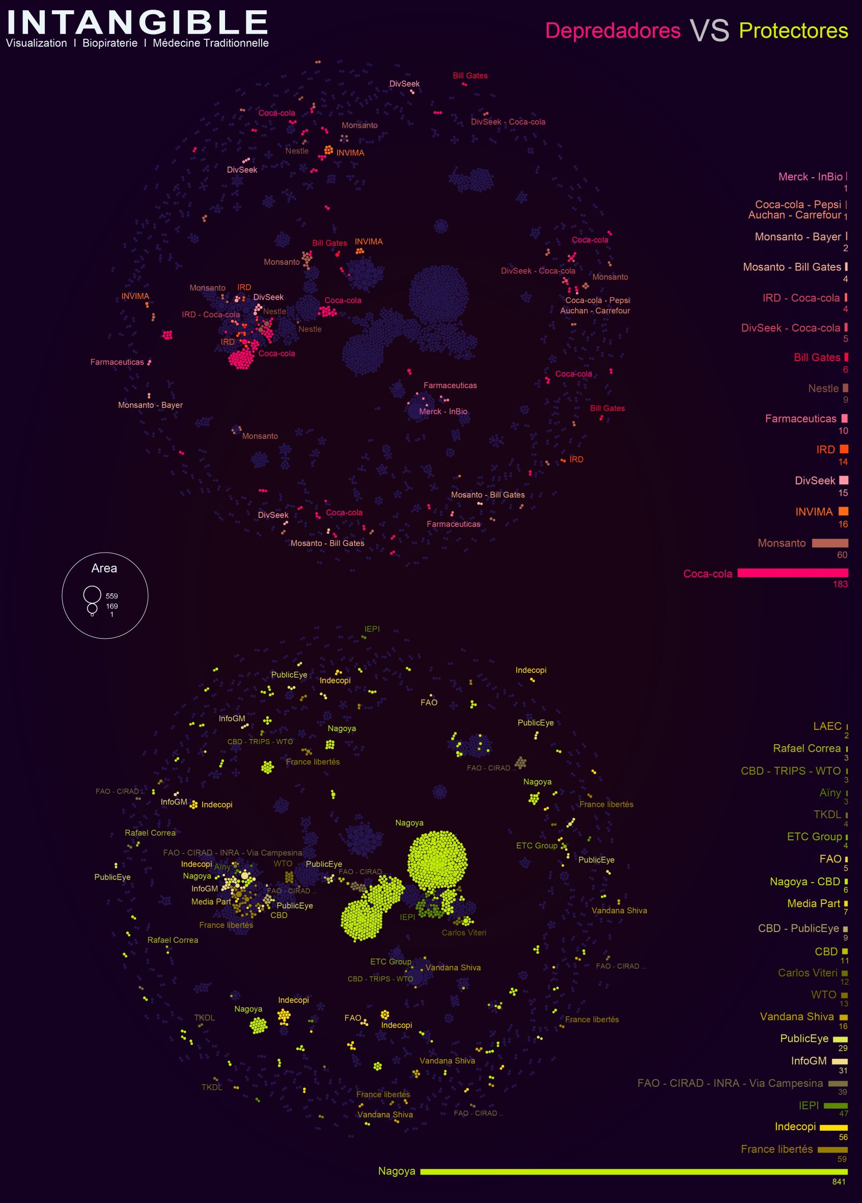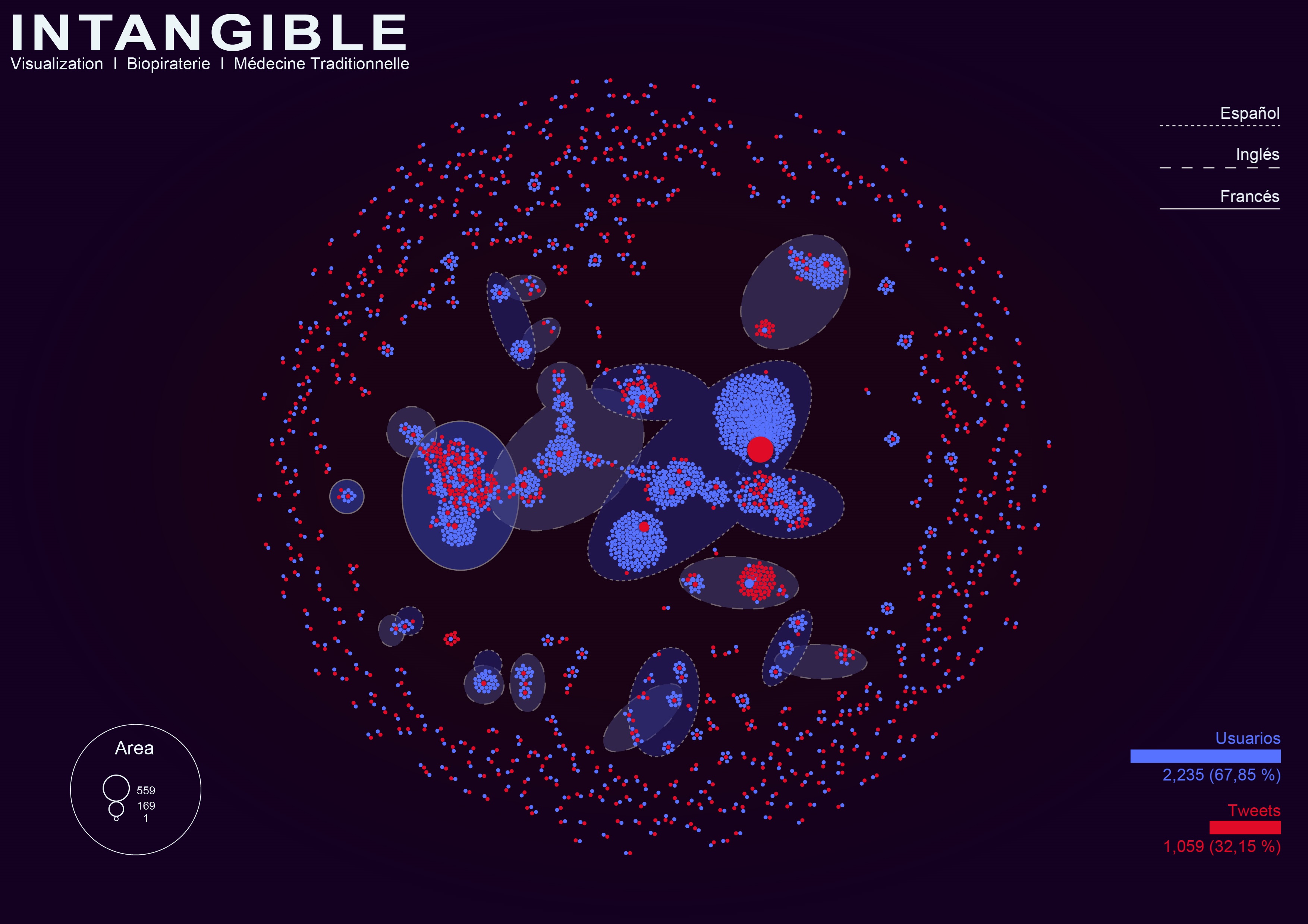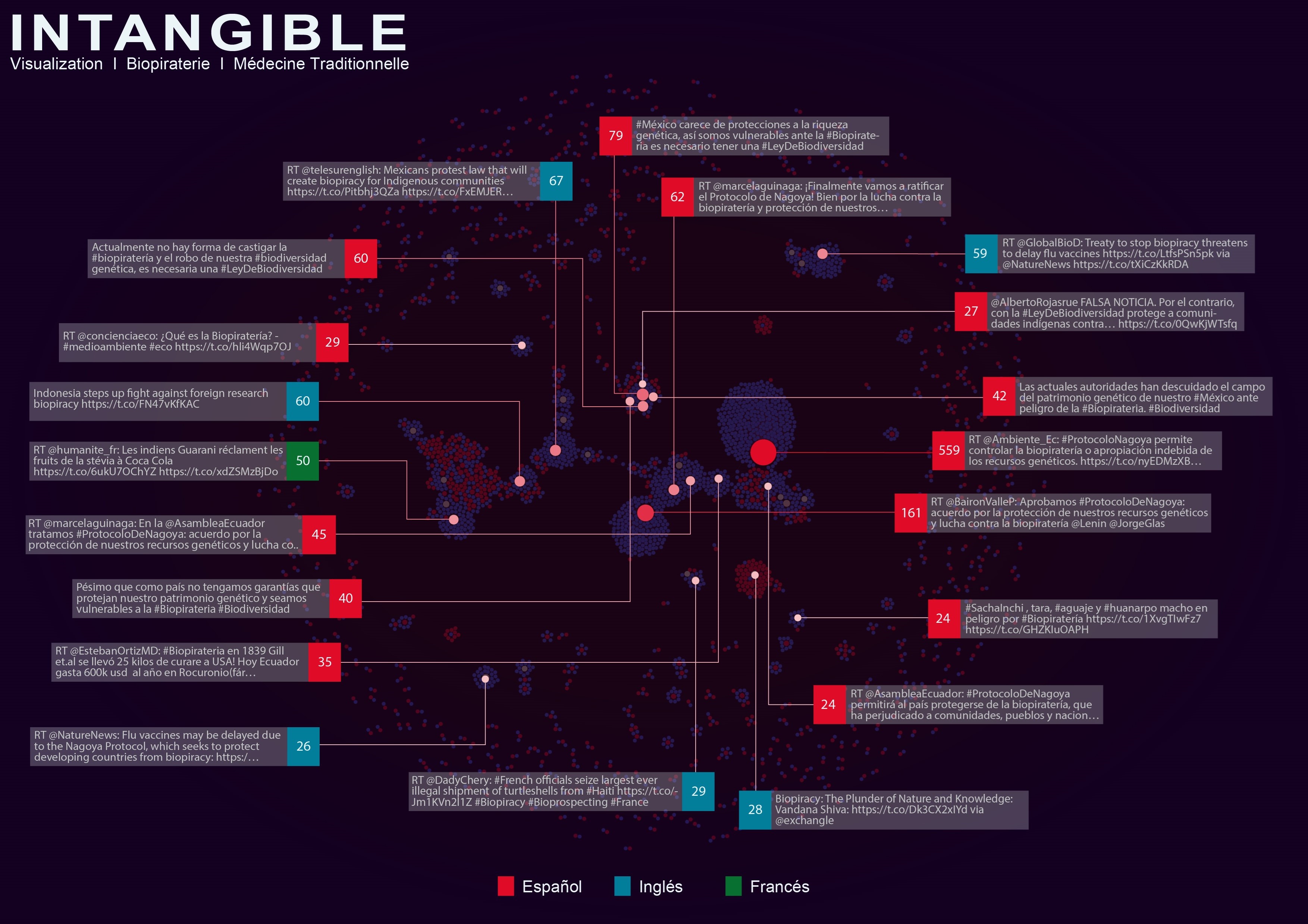 La cartografía y la visualización de datos nos permite observar el contexto de interacción y participación en Twitter. Se identifican en los textos las diferentes entidades y se clasifican según los roles que juegan en el contexto de la biopiratería. En el proceso del diseño visual, se interpreta cada entidad de manera cualitativa y cuantitativa con el objetivo de hacerlos visibles. El carácter global y abierto de Twitter nos permitió identificar a los principales manifestantes en un momento específico. La cartografía presentada es en sí misma una interpretación y por lo tanto es una visión particular de la biopiratería. Por tanto, mediante los métodos digitales fue posible construir un discurso de análisis y visualización para interpretar el fenómeno de la biopiratería de las medicinas tradicionales a partir de las publicaciones de los usuarios.