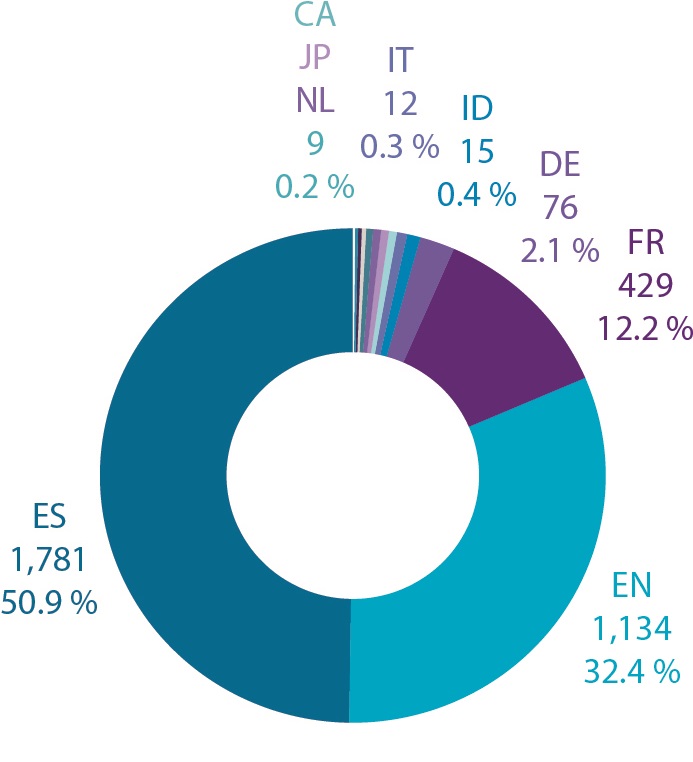 En una primera etapa pudimos observar en la base de datos que el idioma de origen de los usuarios era variado (Fig. 4), aunque las publicaciones principalmente fueron realizadas en inglés, francés y español. En el territorio más grande o principal, se pueden observar a la izquierda el territorio francés, al centro el territorio inglés, el cual sirve de puente al territorio español, y en donde encontramos unicamente contenidos de origen latinoamericano. En tanto, en el territorio francés se puede observar una mayor cantidad de tweets, lo que representa una mayor interacción entre los usuarios.