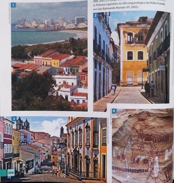 Nesta obra há uma metodologia pertinente a este trabalho, propondo a “leitura de imagens”. Na abertura sobre o Nordeste, tem-se a seguinte citação[8]: “No imaginário popular, o sertão nordestino é o lugar da seca, da terra inóspita e da miséria. Datam do final do século XIX os relatos do escritor Euclides da Cunha, autor de Os Sertões, sobre a aridez e a pobreza dos rincões do Nordeste”. Com a citação e quatro imagens (Figura 5), os autores questionam: “o que você pode supor sobre a Região Nordeste baseando-se nos dados e imagens apresentadas?” (Terra, Araújo & Borges, 2010, p. 195).