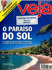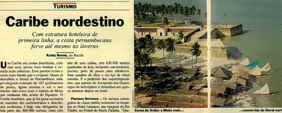 A década de 1990-1999 tem o maior número de matérias sobre o Turismo (11). Em 1992 a revista traz duas reportagens, sendo a primeira uma matéria exclusiva sobre Maceió/AL, contando sobre suas belas praias de águas translúcidas e também dos políticos alagoanos; e a segunda, apresenta a costa pernambucana como “Caribe Nordestino” (Figura 07), descrevendo seu litoral e seus frequentadores, dando ênfase aos endinheirados que possuem suas mansões por ali ou usufruem dos sofisticados hotéis, das lagostas e camarões, de passeios de jet-ski e ultraleve, das “festas de arromba” (Veja nº 1240, pp.76-77, 1992).