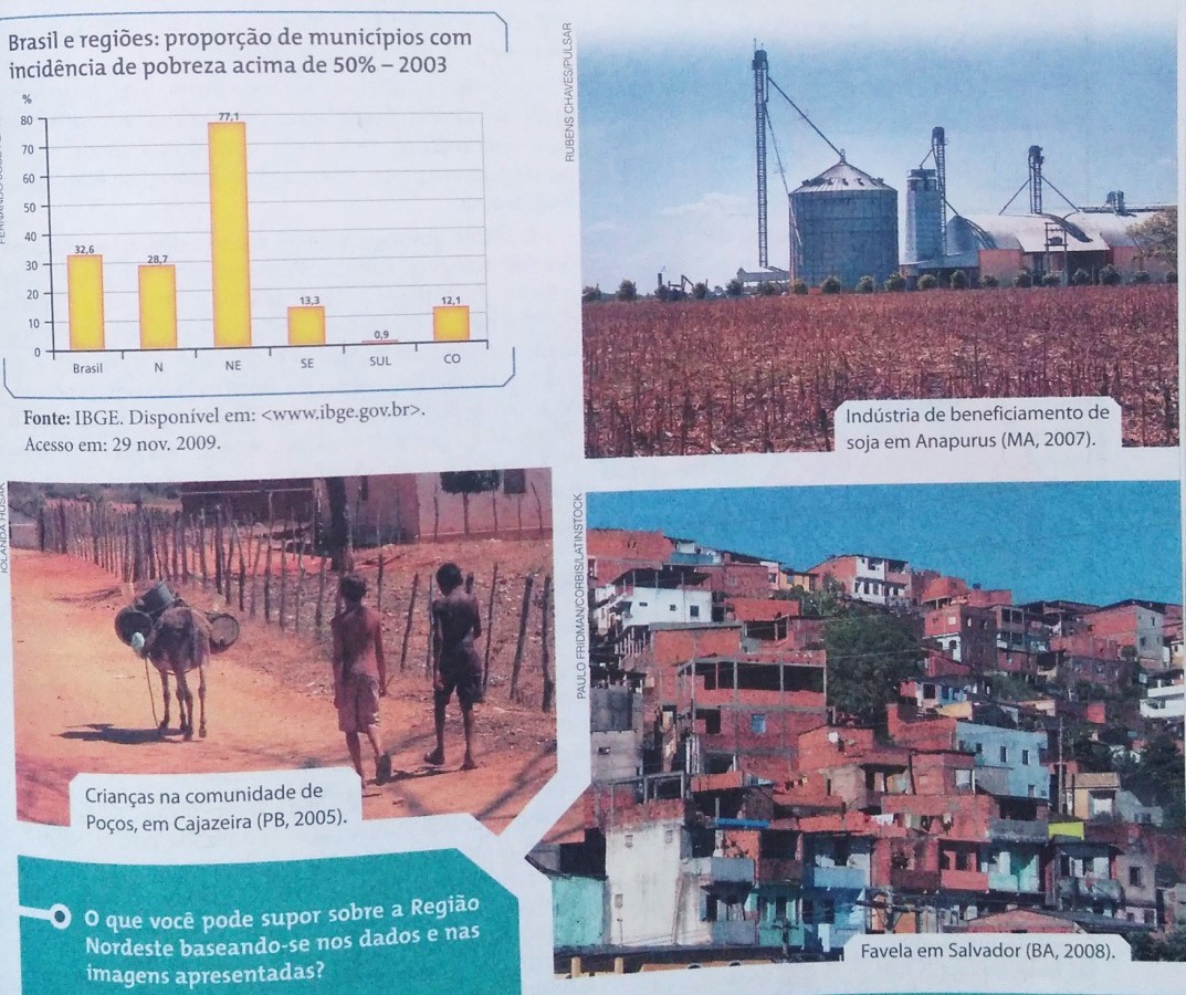 Sobre o sertão, Vesentini (1986, p.209) afirma: “O fato que mais marca o sertão nordestino, para a imprensa e a opinião pública em geral, são suas secas”. E, ao falar sobre o Litoral oriental, comenta os problemas sociais ali encontrados: “aí domina a pobreza, as cidades são cheias de favelas ou ‘mocambos’, a mão-de-obra em geral é mal remunerada e boa parte dos trabalhadores rurais recebem menos que o salário mínimo” (1986, p.209).