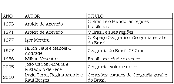 Como ambos os veículos investigados possuem imagens, a relação estabelecida entre textos e imagens também ajudou a análise de conteúdo, uma vez que as imagens também “falam” por si. Os livros didáticos selecionados para a análise foram aqueles de circulação nacional, de autores conceituados na área de Geografia, amplamente utilizados nas escolas públicas e privadas, uma vez que esta disciplina condensa informações gerais e propicia a discussão sobre as regiões brasileiras entre os estudantes do Ensino Médio[2]. Foram analisadas sete obras, largamente utilizadas entre 1963 a 2010, conforme apresentado no Quadro 1, abaixo.