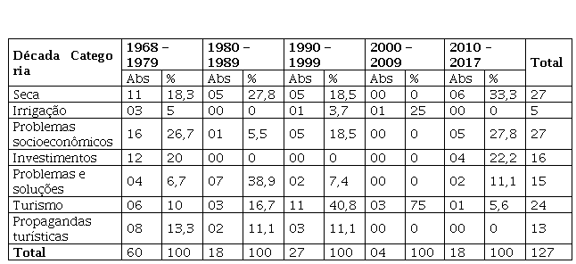 A partir da proposta objetivada neste estudo, isto é, entender como fora formada e ressignificada a imagem do Nordeste, os temas foram categorizados, contabilizados e analisados. Foram estabelecidas sete categorias que nortearam as matérias lidas, são elas: “seca”; “irrigação”; “problemas socioeconômicos”; “investimentos”; “Turismo”; “problemas e soluções” e “propagandas[9]”. Com isso, contabilizados por década em números absolutos e percentuais, tem-se o Quadro 2 apresentado abaixo:
