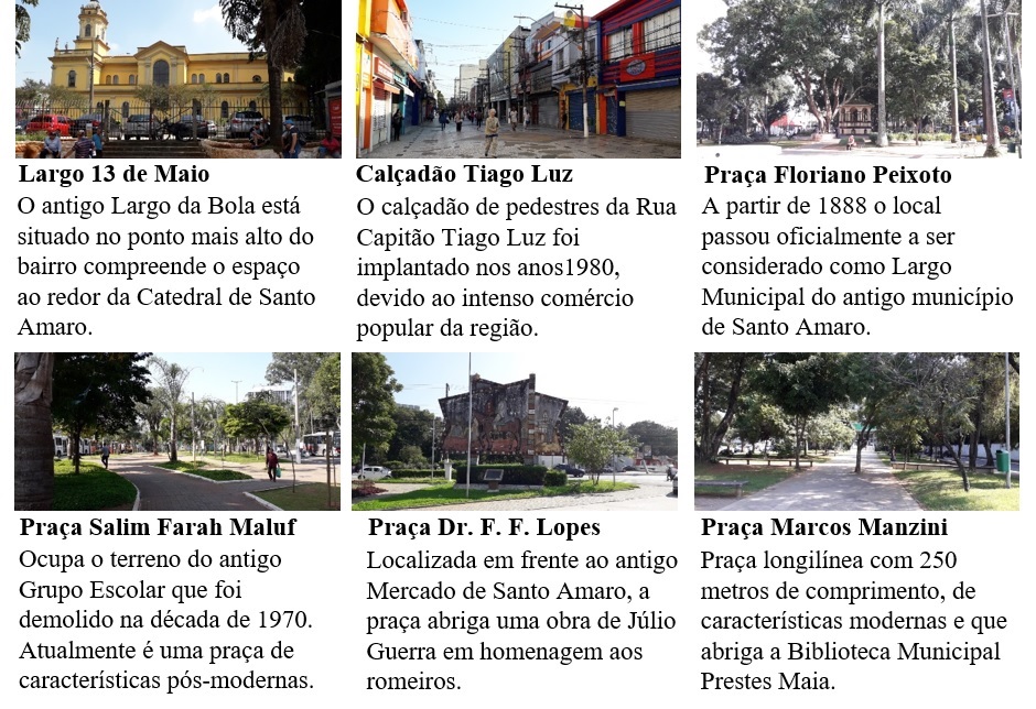 Para os espaços livres, por sua vez, foram mantidos 6 de um total de 7 inicialmente propostos como pontos de interesse de visitação, pois apresentaram as características consideradas relevantes como atrativo turístico (Figura 3). O Cemitério de Santo Amaro foi excluído em função da precariedade das informações disponíveis sobre a arte tumular existente.