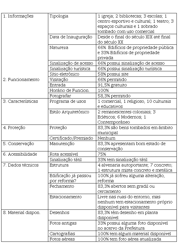 A análise dos dados comprova que: as 12 edificações possuem tipologias de usos diversificadas e representam um amplo período histórico que vai desde o final do século XIX até o final do século XX; a maioria das edificações permite acesso gratuito e dois terços apresentam algum tipo de sinalização de acesso ou turística; todos os edifícios já sofreram alguma reforma ou adaptação e a maioria apresenta atualmente bom estado de conservação. A principal carência do conjunto de edificações está na sinalização tátil, pois apenas 33% seguem as normas de acessibilidade. Os resultados demonstram, portanto, a possibilidade de inclusão dos 12 exemplares no roteiro turístico proposto.