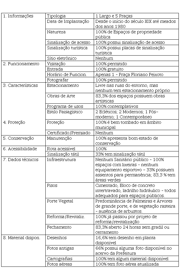 A análise dos dados aponta que: a maioria dos espaços livres estudados é composto por praças e representam um período de implantação que abrange desde o início do século XIX até meados dos anos 1980; todos os espaços livres são de propriedade pública e possuem sinalização de acesso e turística, e com acesso gratuito; todos os ambientes estão em bom estado de conservação e já passaram por projetos de reforma ou revitalização; a maioria dos espaços livres possui área verde significativa. A principal carência do conjunto está na ausência de sanitários para uso público, e no fato de apenas um terço dos ambientes possuírem assentos para permanência. Os resultados demonstram, portanto, a relevância dos 6 exemplares para a composição do roteiro turístico dos espaços livres de Santo Amaro.