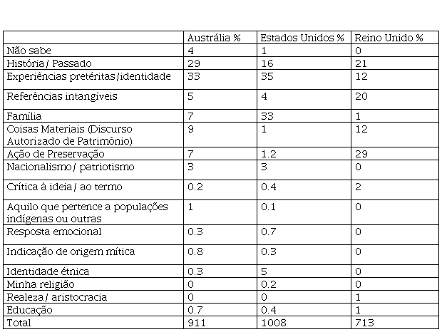 Para ilustrar, quero lançar mão de uma pesquisa que publiquei recentemente no livro Emotional Heritage (2021). O Quadro 1 registra respostas abertas de 2.632 pessoas na Inglaterra, Austrália e nos Estados Unidos, a quem foi feita a pergunta “o que a palavra patrimônio significa para você?”