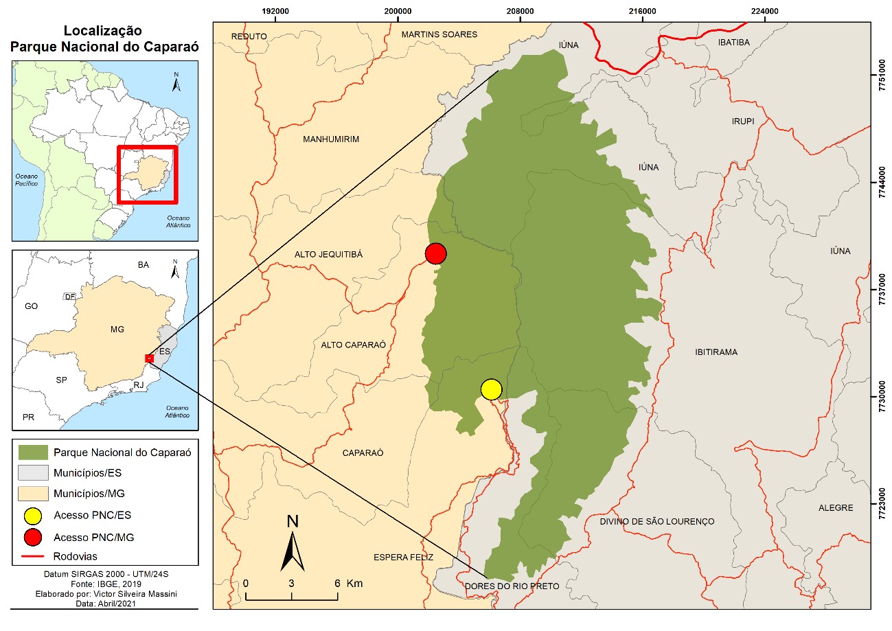 O PNC (Figura 1), situa-se na divisa dos estados de Minas Gerais (MG) e do Espírito Santo (ES). Compreende uma área de 318 km., abrangendo nove municípios: Alto Caparaó, Alto Jequitibá, Caparaó e Espera Feliz (MG); Divino de São Lourenço, Dores do Rio Preto, Ibitirama, Irupi e Iúna (ES).