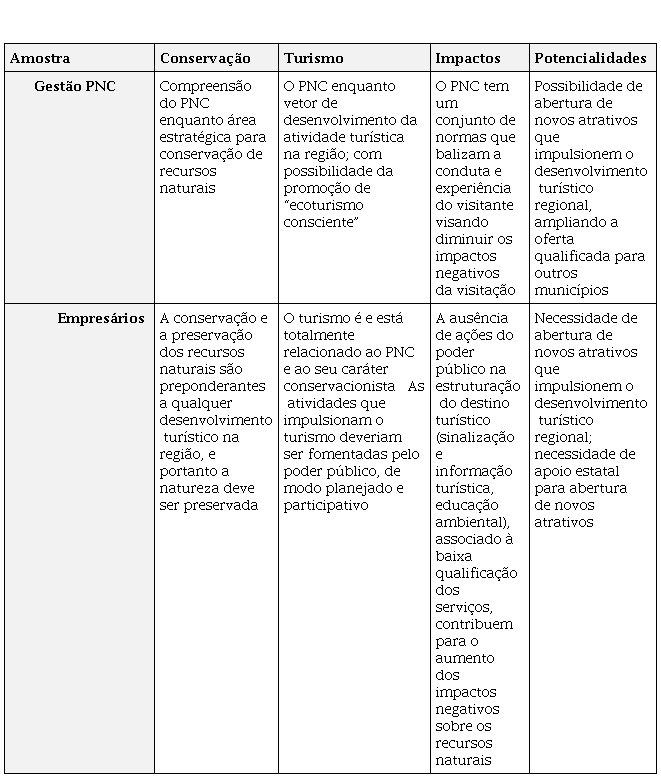Após o aprofundamento sobre questões de organização e em que se baseiam as atividades turísticas desenvolvidas na área envolta ao contexto do PNC, observa-se que essa atividade (em especial o turismo de natureza), tem relevância para as comunidades da região, sobretudo dos municípios circundantes ao parque.