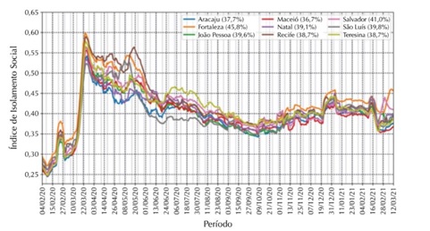Mas no Brasil, conforme destacam Kerr et al. (2021) e Hallal (2021), há um fator importante para compreender o alto número de casos e de mortes pela Covid-19: a conduta negacionista, irresponsável e omissa do Governo Federal, em especial do chefe de Estado, diante das medidas de enfrentamento da pandemia. Essa postura, segundo Hallal (2021), contribuiu para o descrédito em relação à necessidade de distanciamento social e para o desestímulo à vacinação. Nas grandes cidades do Nordeste, por exemplo, o índice de isolamento social permaneceu acima de 0,45 somente nos meses de abril, maio e junho de 2020, e caiu significativamente a partir de julho de 2020 (gráfico 1).