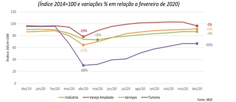 Já o turismo na capital, Natal, além de ser ancorado no turismo de sol e mar, sua rede hoteleira também depende do turismo de eventos e de negócios que contribui para amenizar a sazonalidade. Entretanto, para se ter ideia, o Centro de Convenções de Natal, administrado pela Emprotur, realizou 7 eventos em janeiro e 1 evento em novembro de 2020, totalizando 8 eventos no ano, enquanto em 2019 foram realizados 45 eventos[6]. Apesar de carecer de dados mais específicos, é notório que o turismo de negócios e o turismo de eventos, importantes segmentos turísticos para as capitais nordestinas, não retomaram em 2020. As reuniões e eventos por videoconferência e outras plataformas digitais estão substituindo a necessidade da presença física das pessoas, situação potencializada pela pandemia.