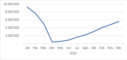 Nesse cenário de agravantes, também se inclui a retomada do turismo no país, no segundo semestre de 2020, que apesar de ter sido um dos setores mais afetados em termos econômicos (gráfico 2), apresentou crescimento a partir do mês de julho, como se pode observar na movimentação de passageiros de voos domésticos nos aeroportos brasileiros (gráfico 3).