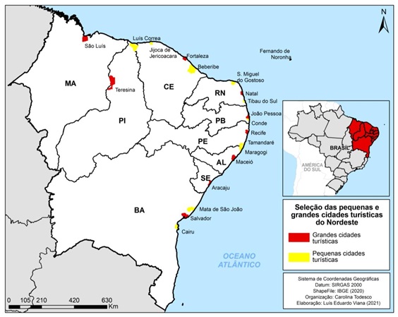 No segundo momento, foi feito um novo recorte na amostra, selecionando as capitais dos estados nordestinos (metrópoles e capital regional), na categoria de grandes cidades turísticas: São Luís/MA, Teresina/PI, Fortaleza/CE, Natal/RN, João Pessoa/PB, Maceió/AL, Recife/PE, Aracaju/SE e Salvador/BA; e até 2 pequenas cidades turísticas (centros locais), por estado: Luís Correa/PI, Jijoca de Jericoacora/CE, Beberibe/CE, Tibau do Sul/RN, São Miguel do Gostoso/RN, Conde/PB, Japaratinga/AL, Maragogi/AL, Fernando de Noronha/PE, Tamandaré/PE, Cairu/BA e Mata de São João/BA; totalizando 21 municípios (mapa 1), sendo apenas Teresina localizada no interior, enquanto todas as demais cidades são litorâneas. Nos estados da Bahia, Ceará e Pernambuco, que possuem mais de 2 pequenas cidades turísticas, foram selecionados os municípios com os maiores índices turísticos da categorização.