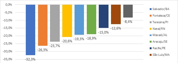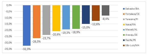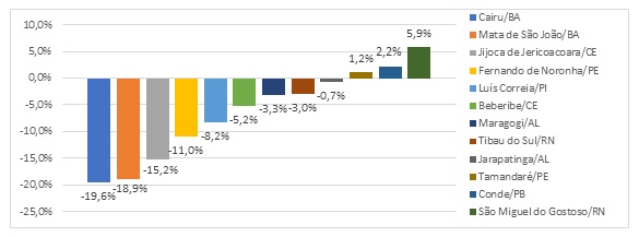 Em relação ao desempenho do setor hoteleiro durante o ano pandêmico de 2020, nota-se que, em termos relativos, as grandes cidades turísticas perderam mais postos de trabalho do que as pequenas cidades. Salvador/BA foi a cidade que apresentou a maior perda de postos de trabalho em hotéis, em comparação ao ano de 2019 (-32,3%); em seguida vem a cidade de Fortaleza/CE (-26,3%), Teresina/PI (-23,7%) e Natal/RN (-20,9%). A capital que apresentou a menor perda foi João Pessoa/PB (-8,4%), enquanto o pequeno município de Conde/PB atingiu um saldo positivo de 2,2%. Verifica-se, portanto, que dentre os pequenos municípios turísticos as perdas foram menores, tendo alguns, inclusive, apresentado crescimento comparado com o ano de 2019. Identificou-se maiores perdas de postos de trabalho em hotéis em Cairu/BA e Mata de São João/BA, que registraram -19,6% e -18,9%, respectivamente, ambos localizados próximos à metrópole Salvador (mapa 1), que registrou uma perda muito superior (gráficos 5 e 6).