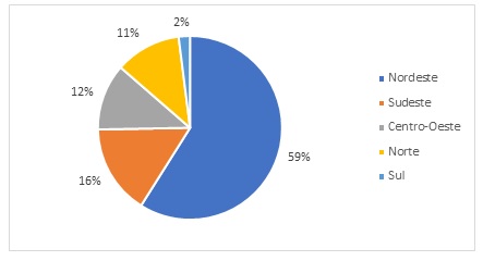 Na pesquisa sobre a demanda turística, realizada no âmbito do Grupo de Pesquisa Turismo em Tempos de Pandemia: uma análise multi e trans-escalar, verifica-se que dos 4.612 respondentes, 2.406 viajaram a lazer durante o período de abril de 2020 a fevereiro de 2021, correspondendo a 52,2%, o que significa que metade dos residentes no Brasil, acima de 18 anos, realizaram viagens a lazer durante a pandemia. Desses que viajaram a lazer, 957 realizaram ao menos uma viagem para a região Nordeste, correspondendo a 39,8%, revelando que o Nordeste foi um dos principais destinos de viagem. Desse universo de 957 respondentes que viajaram a lazer para/pelo Nordeste, 59% eram oriundos da própria região, 16% eram procedentes da região Sudeste, 12% do Centro-Oeste, 12% do Norte e 2% da região Sul (gráfico 7). Esse dado demonstra que o turismo na região Nordeste retomou suas atividades principalmente com turistas da própria região.