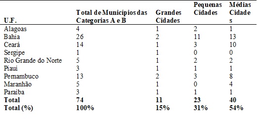 Para o recorte espacial do estudo, primeiramente foram selecionados os destinos turísticos da região Nordeste, tendo como base a categorização dos municípios do Mapa do Turismo Brasileiro, elaborado pelo Ministério do Turismo (Brasil, 2019). A partir do número de estabelecimentos e de empregos do setor de hospedagem, da estimativa de fluxo doméstico e internacional de turistas e dos impostos federais gerados pelo setor de hospedagem, o Ministério do Turismo atribui uma categoria aos municípios pertencentes às regiões turísticas, que varia de A até E. Na pesquisa, foram priorizados os destinos turísticos classificados nas duas categorias mais elevadas, ou seja, A e B. Com tais critérios, foram identificados, na região Nordeste, 74 municípios, sendo que desses 11 são grandes cidades, incluindo as 9 capitais, e 23 são pequenas cidades, considerando, neste estudo, aquelas com menos de 50 mil habitantes (tabela 1).
