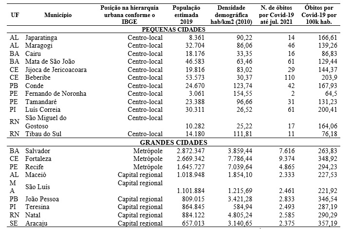 Como se pode observar na tabela 2, em termos absolutos e relativos, as pequenas cidades são as que apresentam os menores números de óbitos por Covid-19, considerando dados coletados até julho de 2021: Fernando de Noronha/PE contabilizou ao total 2 óbitos e o município que apresentou o maior número foi Beberibe/CE, com 110 óbitos. A relação de óbitos por 100 mil/hab varia de 64,5 a 200,41 nas cidades pequenas. Sendo que o município de Luís Correia/PI, que detém 200,41 óbitos por 100 mil/hab, contabilizou ao total 61 mortes.