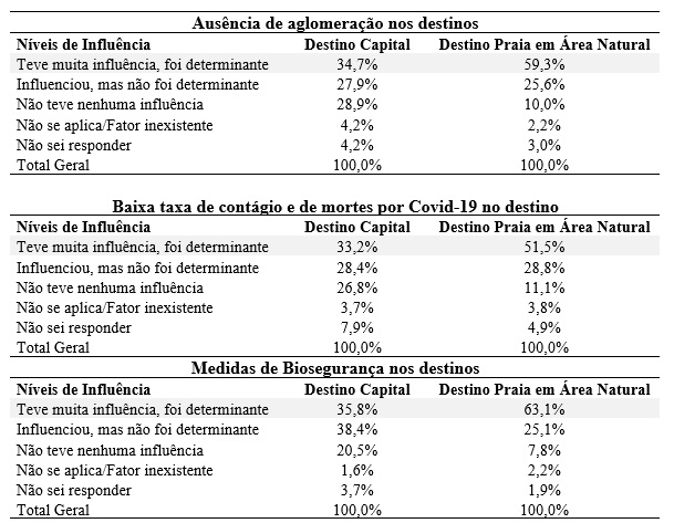 Em relação aos fatores de influência nas decisões de viajar a lazer para destinos do Nordeste (tabela 3), a pesquisa revela que a maioria dos turistas que se dirigiu para praias em áreas naturais considerou determinante os três seguintes fatores: ausência de aglomeração nos destinos (59,3%); baixa taxa de contágio e de mortes por Covid-19 no destino (51,5%); e medidas de biossegurança nos destinos (63,1%). Esses mesmos fatores não foram representativos para o grupo de turistas que se destinou para as capitais, tendo variado de 33,2% a 35,8%.