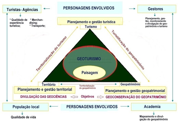 Assim, o geoturismo, seja ele urbano ou rural/natural, envolve três grandes elementos que se entrecruzam: o geopatrimônio, o território e o turismo, sendo que o geopatrimônio, objeto em questão, está inserido em um determinado território, em que a promoção e o desenvolvimento da atividade turística é resultado da ação conjunta dos gestores (poder público), agências turísticas, turistas, acadêmicos e comunidade local, cada qual tendo um papel fundamental nessa atividade (figura 1).