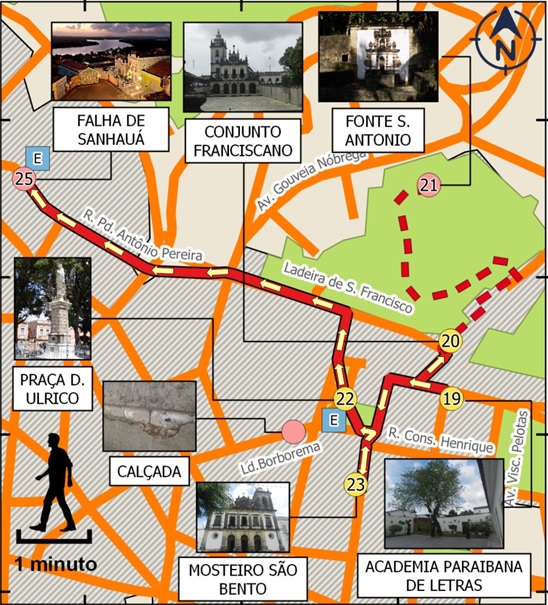 Destaques: (19) Academia Paraibana de Letras; (20) Centro Cultural São Francisco; (21) Fonte de Santo Antônio; (22) Praça d. Ulrico; (23) Mosteiro de São Bento; (25) Falha de Sanhauá.