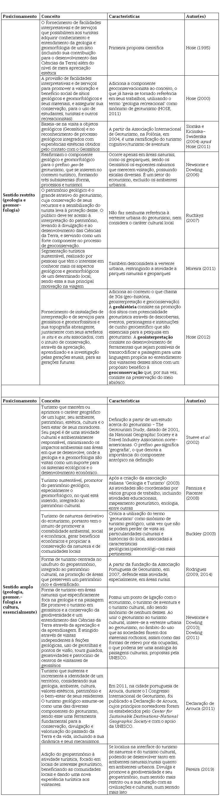 A introdução da definição do ‘geoturismo’ acabou por nortear dois grandes posicionamentos acerca da temática na comunidade acadêmica: uma visão restrita, como a de Hose (1995), onde na maioria das vezes o prefixo geo era sinônimo de geológico ou, no máximo, geomorfológico, restringindo essa atividade a zonas naturais/rurais, como os geoparques e excluindo as zonas urbanas. Seguidores dessa tendência, cita-se Newsome e Dowling (2006), Ruchkys (2007), Moreira (2008), entre outros. E, a partir do conceito proposto pela National Geographic (2001 apud Stueve et al, 2002), foi lançada uma visão ampla, holística e mais abrangente da paisagem, focada não somente na paisagem natural mas também na cultura das áreas em que se desenvolve, ampliando os ativos do destino. Destacam-se as definições de Buckley (2003), Newsome e Dowling (2010), a Declaração de Arouca (2011), entre outras. Essa visão mais ampla da atividade será seguida nesta tese, cuja definição será proposta a seguir. Os dois posicionamentos distintos encontram-se sumarizados na Tabela 1, com as suas principais características.