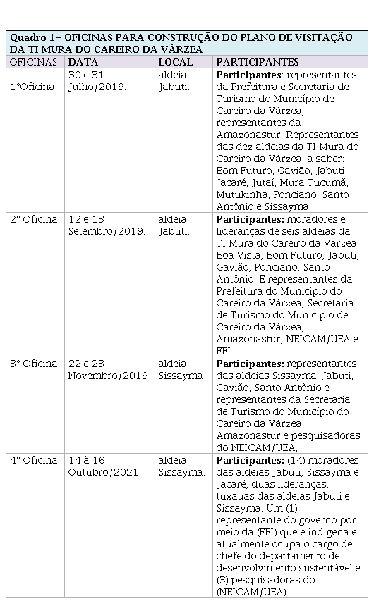 É importante ressaltar que existem dois cenários representativos no processo de elaboração do Plano de Visitação para a TI Mura do Careiro da Várzea. O período anterior a pandemia da Covid-19 (2019) e o período após a sua instalação (2020 a 2022). Ao longo de 2019 havia uma forte articulação por parte das lideranças indígenas Mura em torno da elaboração do Plano de Visitação, a exemplo da realização das oficinas, componente exigido na IN03/2015, no processo de elaboração do Plano. Nesse momento a construção participativa do Plano, mediante a realização de oficinas, envolveu atores sociais de diferentes instituições indígenas e não indígenas. Com a pandemia da Covid-19, as oficinas paralisaram, sendo retomadas no dia 14 de Outubro de 2021conforme será apresentado no quadro 01. Dentre algumas mudanças encontradas no processo de construção do plano na segunda fase, estão uma menor participação de todas as aldeias do território se comparada à primeira fase. Notou-se que quatro aldeias estavam mais articuladas em torno do processo sendo elas as aldeias Jabuti, Sissayma, Galiléia e Gavião.