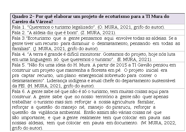Com o intuito de apresentar os principais motivos que levaram os representantes do Povo Mura a criar o Projeto de Ecoturismo Comunitário Jabuti, estruturou-se o quadro 2, elaborado a partir da transcrição dos relatos obtidos durante as entrevistas.