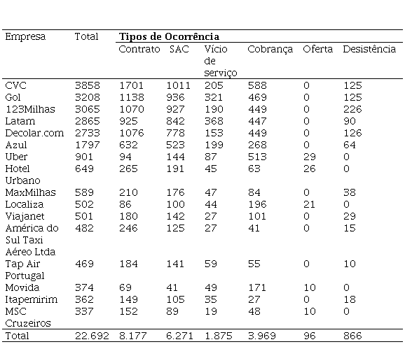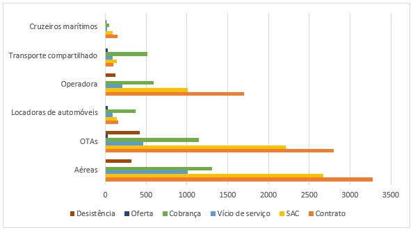 O Sistema Nacional de Informações de Defesa do Consumidor (SINDEC) registrou 1,01 milhão de ocorrências em 2022. No ano, 18 empresas do setor de turismo se configuravam entre as 200 organizações com maior número de litígios de consumo, totalizando 22,7 mil ocorrências (22,4% dos atendimentos). Entre os fornecedores de serviços turísticos, o número mais expressivo de ocorrências jurídicas foi registrado entre organizações que prestam serviços por meio de contratos na Internet. Há uma predominância de empresas aéreas (6 empresas), agências online (OTAs) de reservas de hospedagem e passagens aéreas (5 empresas), locadoras de automóveis (2 empresas), além de operadoras de turismo, cruzeiros marítimos e transporte compartilhado. Os dados do SINDEC (2022) indicam ainda que o problema mais comum entre empresas de turismo diz respeito a cláusulas contratuais (36%), seguido de atendimento ao cliente (27,6%), cobrança indevida (17,5%) e vício de serviço (8,3%). Registros de desistência de compra (3,8%) e discrepância na oferta contratada (0,4%) foram menos numerosos, como demonstrado nos dados da Tabela 1.