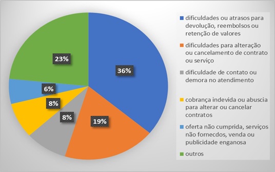 Os assuntos mais reclamados sobre empresas da categoria de ‘viagens, turismo e hospedagem’ no ano de 2021 são ilustrados na Figura 2. A predominância de problemas com reembolso e devolução refletem alterações em massa provocadas pela pandemia da covid-19. Normas de exceção, como as Leis n. 10.046/2020 e n. 14.034/2020 , buscaram flexibilizar a legislação consumerista quanto a prazos e direito ao reembolso.
