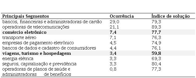 Em complemento, os dados mais recentes do relatório da plataforma Consumidor.gov, referentes ao ano de 2021, indicam que o atendimento nos segmentos ‘comércio eletrônico’ e ‘viagens, turismo e hospedagem’ representou respectivamente 7,4% e 3,4% das 1,4 milhão de ocorrências. A Tabela 2 compila a percentagem de ocorrências dos principais segmentos econômicos e permite apontar que serviços de viagens, turismo e hospedagem se caracterizam por reunir empresas com o menor índice de solução das ocorrências: 59,8% contra média geral de 78,4%.
