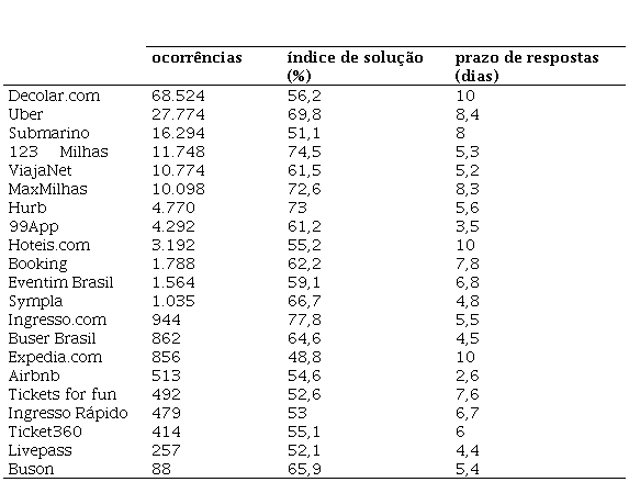 Quando considerados todos os segmentos da base de dados Consumidor.gov, o maior número de ocorrências entre os fornecedores de serviços turísticos é registrado entre empresas aéreas, agências online (OTAs) e programas de fidelidade. Quando consideradas apenas plataformas on-line e de serviços compartilhados (Tabela 3), constata-se que o índice médio de solução de problemas (61,3%) é menor do que a média geral de todas as empresas (78,4%). Também se verifica uma discrepância no prazo de respostas das empresas aos consumidores, cuja média é de 6,5 dias. Com exceção da empresa Uber (8,4 dias), plataformas de compartilhamento apresentam maior agilidade no tempo de resposta: 2,6 dias no AirBnB; 3,5 dias na 99App; e 4,5 dias na Buser.