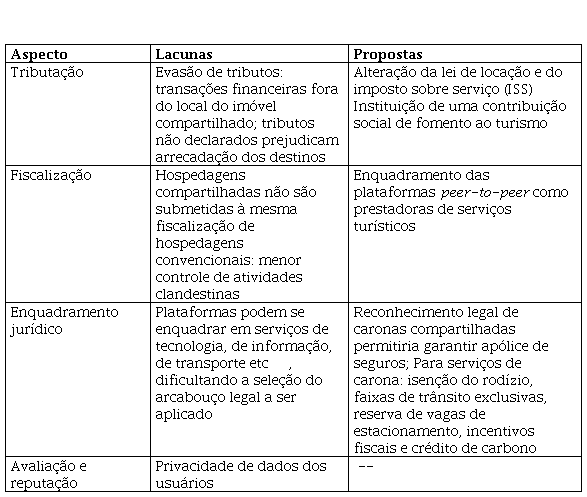 Desde os anos 1990, instâncias legislativas brasileiras têm aprimorado as normas de defesa do consumidor, observando modalidades de comércio eletrônico e consumo colaborativo nos diversos setores da economia. Na esfera federal, regulamentações jurídicas sobre economia compartilhada são debatidas em comissões permanentes da Câmara dos Deputados, como as de Defesa do Consumidor; de Economia, Indústria, Comércio e Serviços; e de Turismo. A constituição da Comissão Especial do Marco Regulatório da Economia Colaborativa, em 2017, evidencia maior atenção a esse segmento. Essa comissão reuniu empresas responsáveis por plataformas peer-to-peer e comércio eletrônico, órgãos governamentais, especialistas e entidades da sociedade civil. O impacto da economia compartilhada no turismo e das demandas de regulamentação no setor foram um dos temas debatidos pelos representantes. A Comissão destacou como principais pontos para um Marco Regulatório da Economia Colaborativa questões de responsabilidade civil, avaliação de confiança dos usuários, relações de emprego e tributação. Lacunas e propostas jurídicas de interesse ao setor turístico, identificadas a partir dos registros de audiências públicas, estão resumidas no Quadro 1.