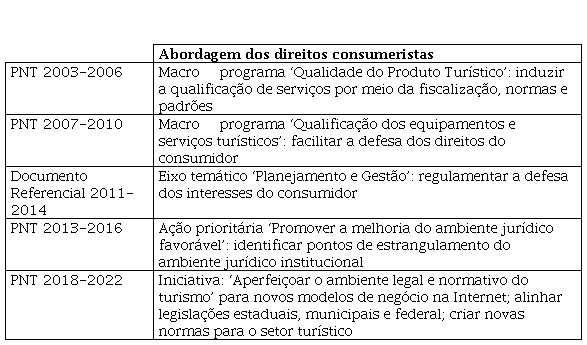 No campo da legislação turística, ainda que as primeiras normas criadas nos anos 1930 e 1940 visassem regular determinados serviços; as abordagens sobre direitos do consumidor foram aprimoradas, principalmente, nas duas últimas décadas. A proteção do consumidor é promovida nas diferentes edições dos Planos Nacionais de Turismo (PNT), mas o tratamento ao tema se modifica ao longo do tempo e pode ser organizado em três principais momentos: i) originalmente, os direitos do turista são discutidos como um aspecto inerente aos esforços de qualificação do setor, enfatizando ações de fiscalização e a regulamentação; ii) no Documento Referencial (2011-2014), os direitos consumeristas perdem ênfase e são abordados de forma indireta, como um componente de processos mais amplos de planejamento e gestão do turismo pátrio; iii) por fim, nas duas últimas edições do PNT, a preocupação com as normas consumeristas se vincula a ações aperfeiçoamento do ambiente jurídico, enfatizando a produção ou revisão de normas que estimulem investimentos e negócios do setor (Quadro 2).