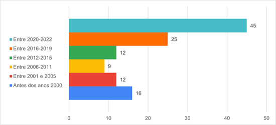 Inicialmente os respondentes foram questionados acerca dos anos em que visitaram o estado da Paraíba. Os resultados apontaram que a maioria das viagens ocorreram entre os anos de 2016 a 2019 e de 2020 a 2022 (cabe ressaltar que a questão abria margem para que os respondentes escolhessem todos os intervalos em que haviam viajado à região), fato que corrobora com os dados da Empresa Paraibana de Turismo (PBTur) acerca do crescimento de turistas chegando ao estado, especialmente a partir do ano de 2017. A figura a seguir apresenta a disposição das respostas dos turistas: